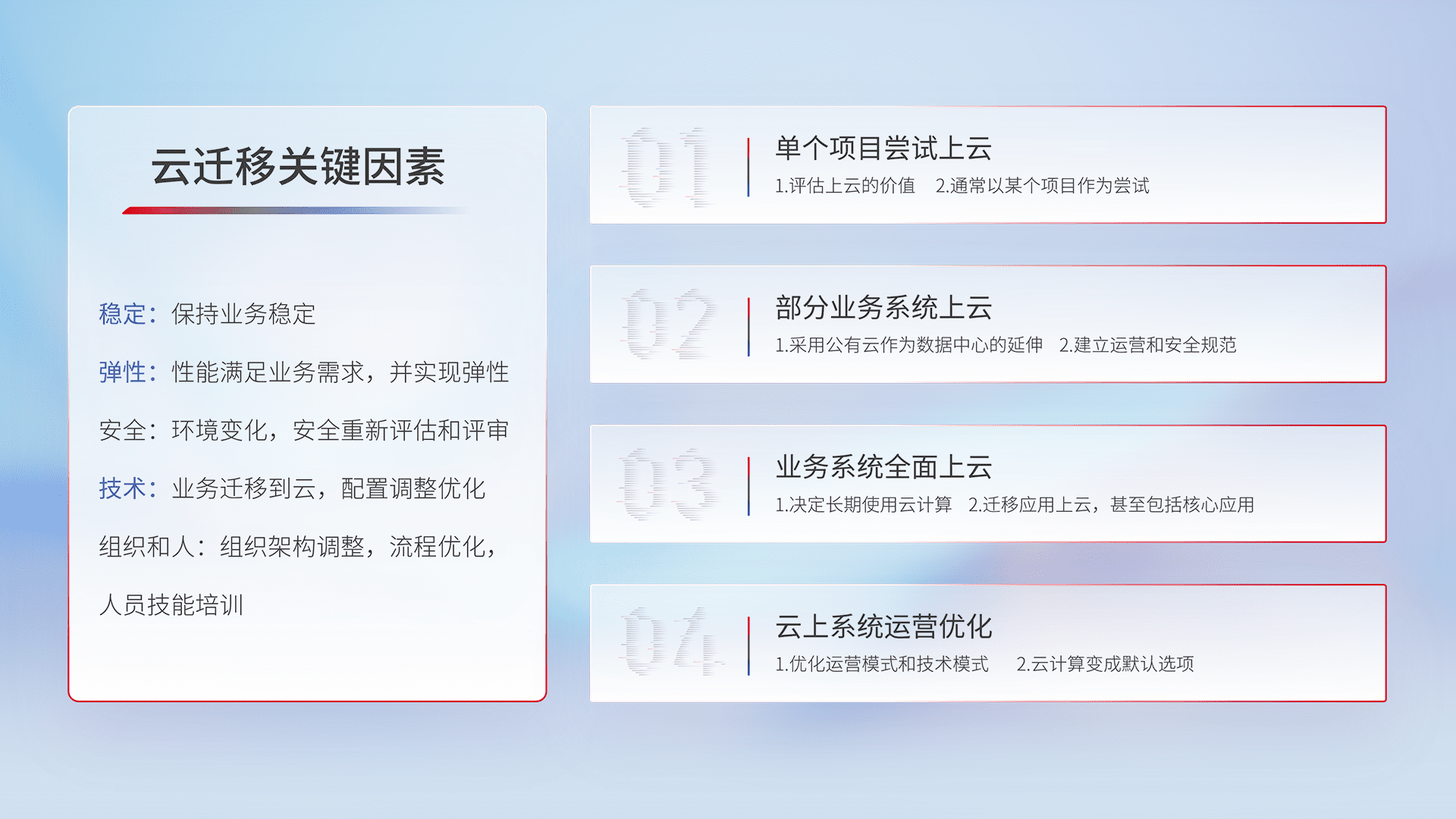 结合实际业务,,从规划设计、、、、云平台选型、、云原生改造、、、、数据迁移、、、集成交付,,,,迁移全过程为客户识别最佳上云路径,,,,做好风险识别管理,,,,设计网络架构、、身份权限、、、、安全审计合规、、、操作审计、、日志审计、、、监控告警策略、、、多站点容灾设计等,,,,对云上基础设施进行整体规划,,,,提升IT治理水平,,以满足弹性、、、高可用、、、高性能的需求。。