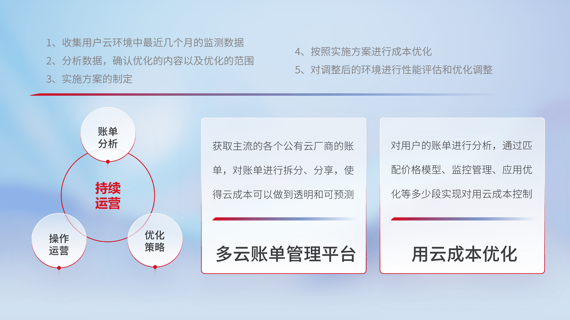 通过多云纳管,,以统一的资源数据模型把客户的云资源进行抽象和封装,,,进而实现对多云资源的统一操作,,,,保障云资源管理的可靠性、、、、稳定性与可用性。。量身定制化运维内容,,配置、、、开发运维、、补丁管理、、、备份、、、、监控、、、、认证和访问管理、、审计和日常巡检等,,,保障在用云过程中的可靠度,,稳定度以及高可用率。。