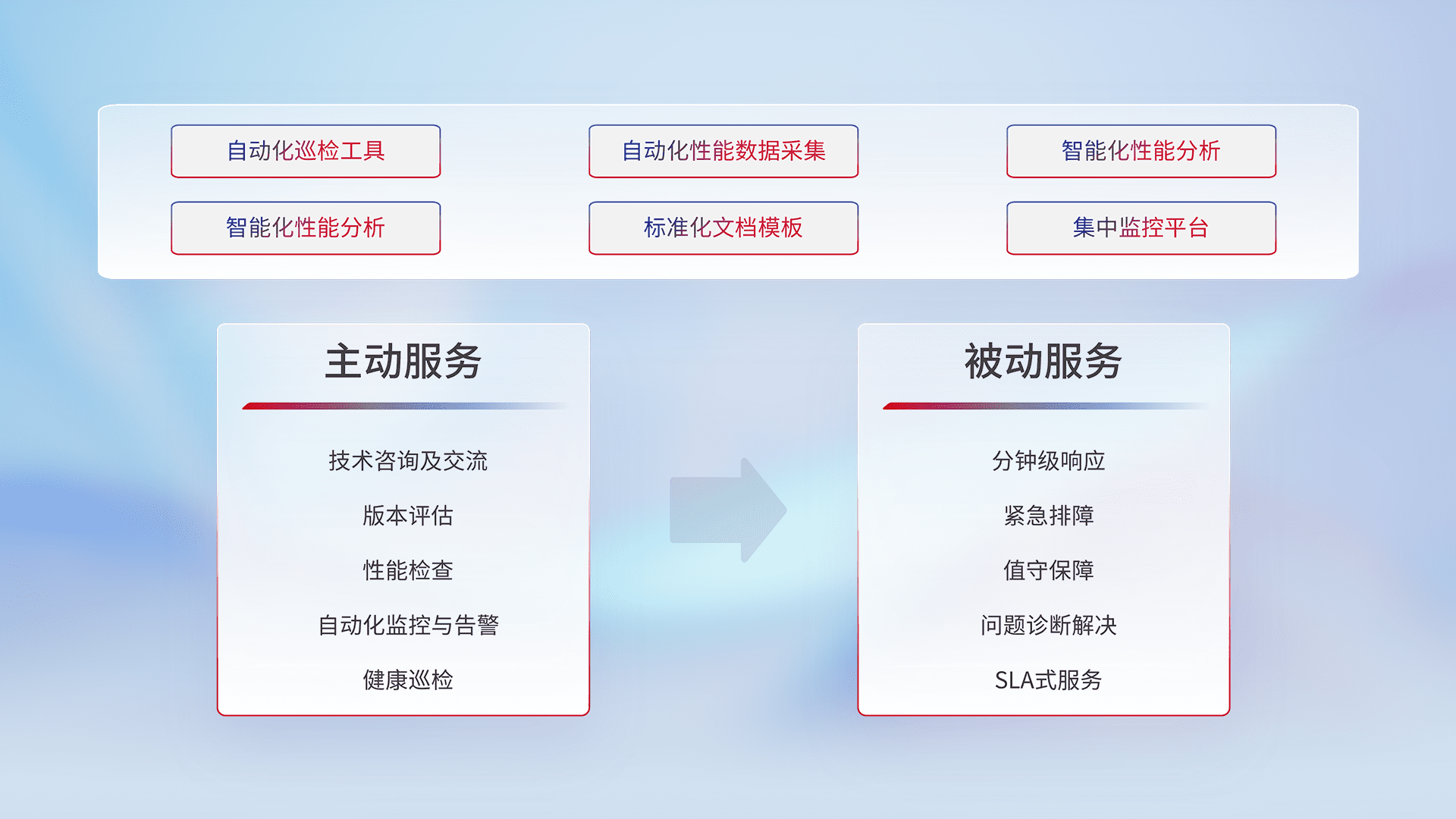 智能化工具和标准化文档,,,保障服务质量,,,提供主动服务(包含技术咨询、、版本评估、、性能检查、、、自动化监控与告警、、健康巡检)和被动服务包含(分钟级响应、、、紧急排障、、、、值守保障、、、问题诊断解决、、、SLA服务)。。